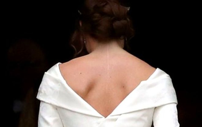 Peter Pilotto ta un diseñador di celebridadnan y fashionistanan manera Emma Watson y Olivia Palermo, pero for di awe su nomber lo ta reconoci. E marca cu ta existi pa 10 aña ta conoci pa su diseño di textil innovativo di un silueta femenino y moderno. Princess Eugenie tin amistad cu e diseñadornan pa algun tempo caba y el a yega di bisti nan creacionnan na otro ocasionnan, pero esaki ta esun miho y mas grandi. E diseñadornan a diseña e shimis perfecto pa nan cliente, cu tabata desea e lomba abou pa asina e cicatriz di su operacion di scoliosis mustra. E prinses a haci e operacion tempo cu e tabatin 12 aña di edad. Riba e shimis tin un cantidad di símbolo como decoracion cu ta significativo. E simbolonan ta Thistle for Scotland, The Shamrock for Ireland, The York Rose for England y The Ivy representando e cas di e pareha. E tabata un dia largo y emocional unda cu e speech di Jack Brooksbank a emociona e 800 invitadonan na e boda.