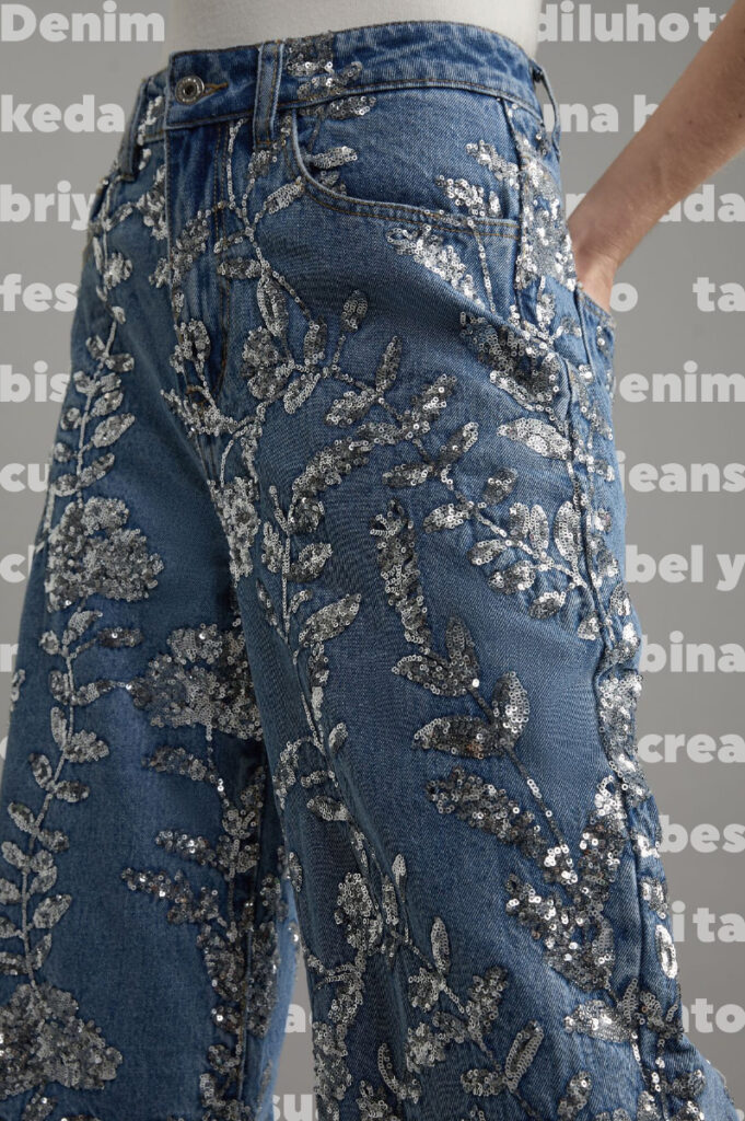 Denim cu e piedranan di luho ta keda un exito, cu a duna hopi briyo durante e temporada festivo. Pero nos no ta bisando ayo ainda. Denim cu stenchi ta duna e jeans clasico un twist remarcabel y na moda. E tela aki combina cu detayenan briyante ta crea un look dibertido y alabes glamuroso. E tendencia aki ta haci denim adecuado pa tanto outfits casual como festivo.